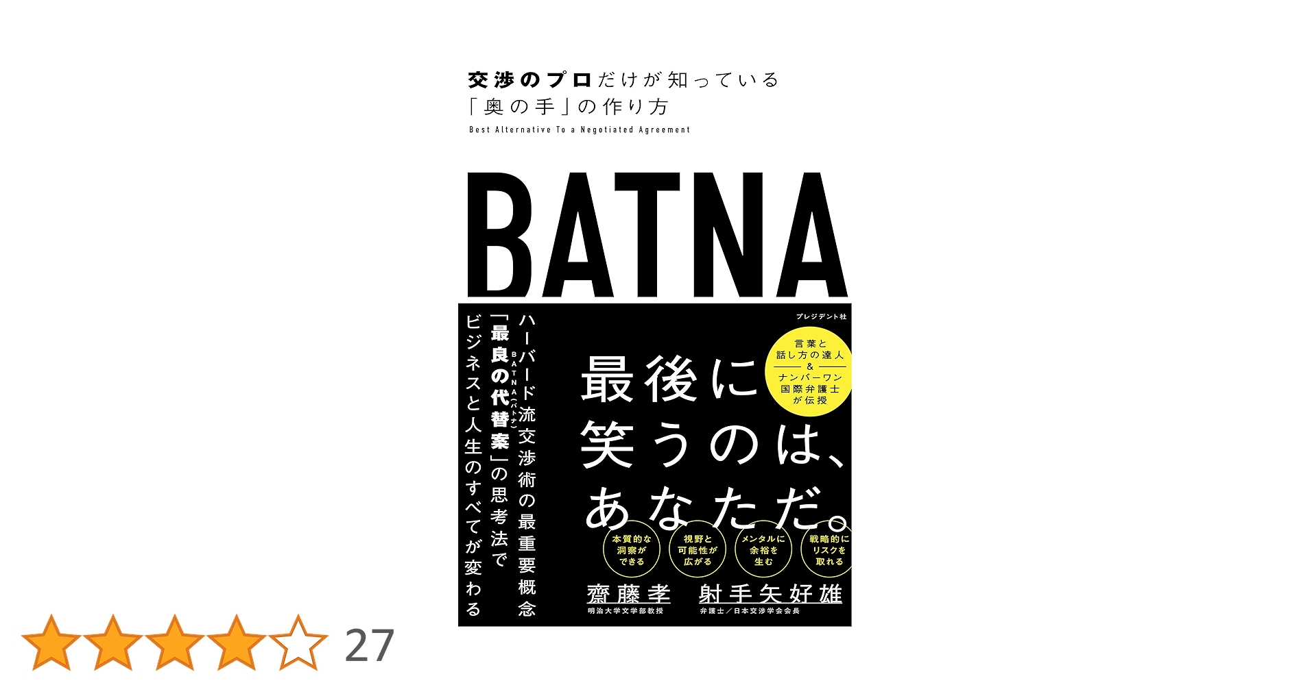 ブックファースト新宿店 ビジネス1位 総合2位 紀伊國屋書店大手町店 ビジネス1位 ハーバード流交渉術の最重要概念である〈BATNA(バトナ)〉。 「代替案のなかで最良の案」を意味する言葉で、いわば交渉の"奥の手"であり、交渉の結果を大きく...