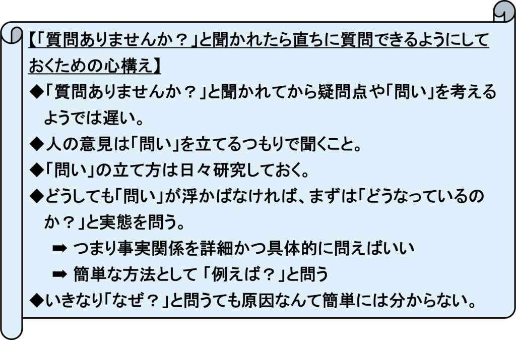 ◆「何か質問ないですか?」と聞かれたら直ちに質問できるようになるために次の訓練をするといい。