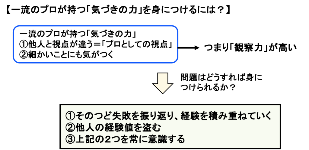 したがって、その道の一流のプロを目指すのなら、一流のプロがどんな視点で何を観察しているのか、言い方を変えると、一流のプロが心がけている気づきの力がどこにあるのかという点を学び続けることが大切です。今回はそんな話しをします。